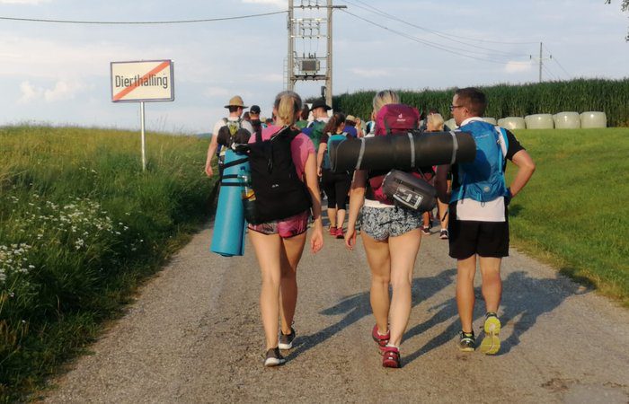 Zirka 40 Wanderer und Wanderinnen machten sich am Freitag Nachmittag auf den Weg nach Kneiding. Über Rainbach, an Münzkirchen vorbei  und mit ein paar Zwischenstopps zur Stärkung kamen alle gut beim Wirt‘z‘Kneiding an. Nach einem guten Abendessen ließen wir den Abend noch gemütlich ausklingen. Geschlafen haben wir über dem Bach in der Outdoor-Kegelbahn und im überdachten Gastgarten.