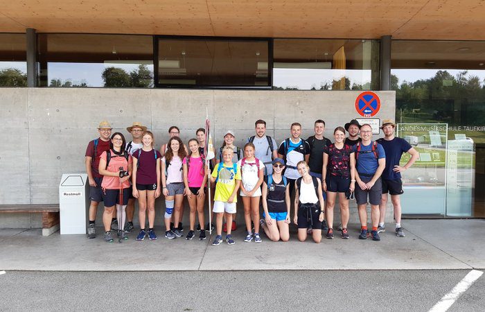 Heute auf nach Prambachkirchen! Geplant waren 24 Kilometer und wenn man sich beim Frühstück etwas umschaute, blickte man in das ein oder andere (sehr) müde Gesicht. Trotzdem marschierten wir kurz nach neun los. Gegen Mittag kamen wir nach Peuerbach wo uns ein Eis die Hitze erträglicher machte. Für manche war sogar ein kleiner Mittagsschlaf drin!Aber umso besser war es, als wir nach einem langen und heißen Tag am Kolmgut ankamen. Wir machten uns gleich auf ins Freibad, um zu duschen und uns abzukühlen, dachten wir zumindest. Denn mit einem Freibad ohne richtige Duschen hatten wir nicht gerechnet. Aber die Not macht ja bekanntlich kreativ, also wurde das Duschgel ausgepackt und mit den vorhandenen Duschen gearbeitet. Den Prambachkirchnern sind wir natürlich sofort aufgefallen und unsere große, zugegebener maßen etwas schräge Gruppe musste für ein Fotoshooting für die Gemeindezeitung herhalten.Auch an diesem Tag haben wir den Abend in unserer Unterkunft mit leckerem Schnitzel und viel Gesang ausklingen lassen.