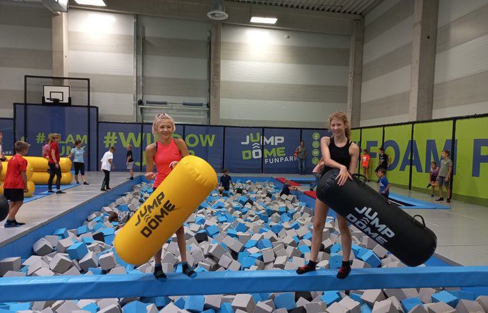 Mit Sprungsocken ausgestatten ging es schon los zu den verschiedenen Trampolinen, in die Schnitzelgrube und durch den Ninja Warrior Parcour.