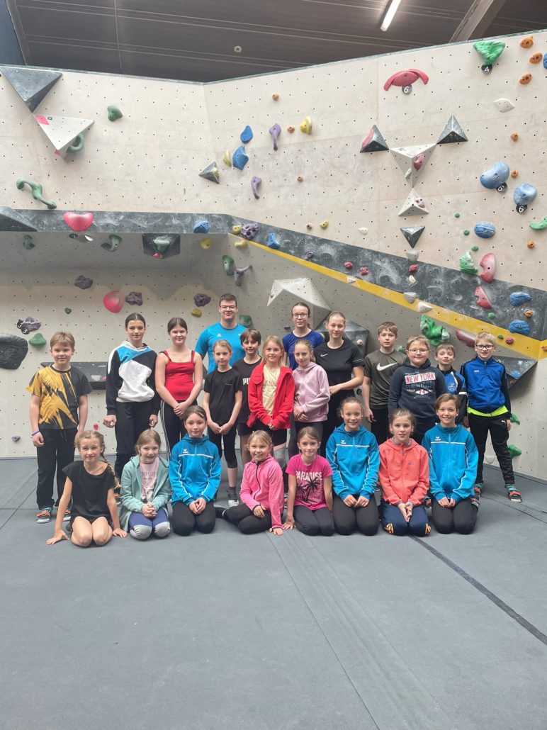 Nach dem Aufwärmen und einer kurzen Einführung von einer Trainerin ging es auch schon an die Wand, wo die Kids die verschiedensten Boulderrouten klettern konnten!